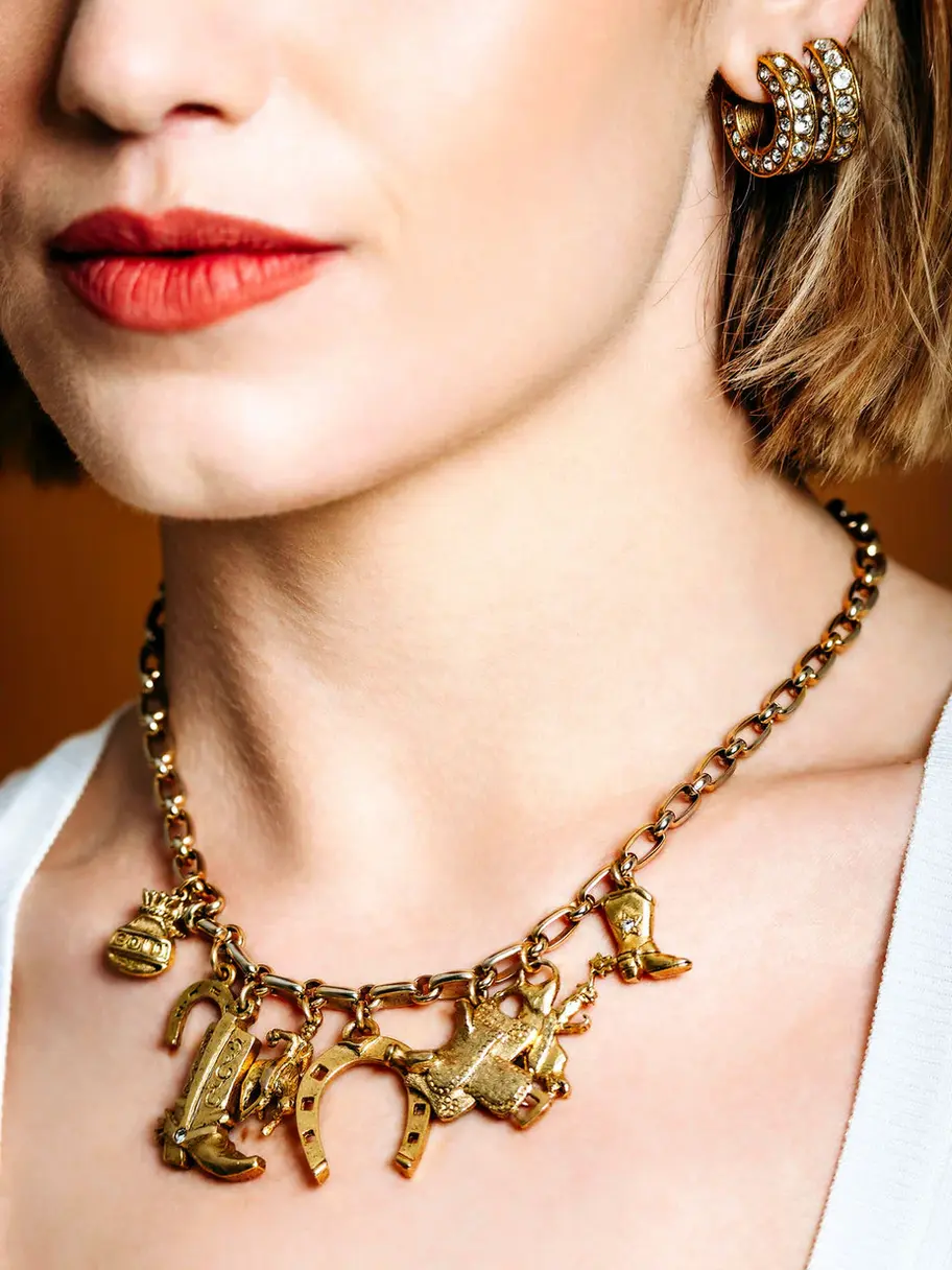Introducing the Dakota Necklace, Beth's top pick from our latest collection. Embrace your inner cowgirl with this charming necklace, featuring golden western-themed charms such as cowboy boots, a saddle, horseshoe, and even a bag of "gold" ! Yee-haw! Swarovski Crystals, 24kt Gold Plate, Proudly Made in the USA.