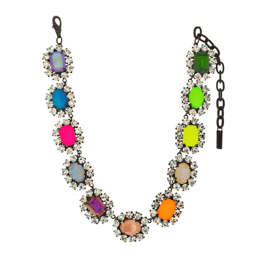 "Say hello to the Edith Collar in Candy Crush - the all-around showstopper! This dazzling stunner is plated with elegant smutt and showered with glimmering high quality crystals. 16" long with a bonus 3" so you can dial it up to 19! Add this beauty to your collection and inject a bit of sparkle into any ensemble. Made in Canada."