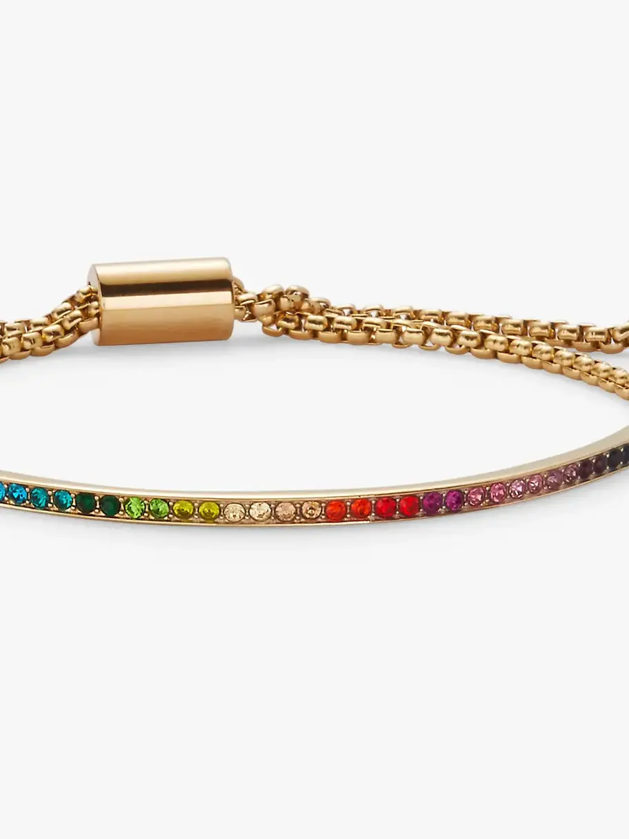 Color that moves with you. This rainbow ombré pavé bracelet blends bold shades of green, blue, purple, pink, red, orange, and yellow into one seamless sparkle moment. The bolo closure makes it fully adjustable and ready to layer. Bright, summery, and totally stackable—this one’s a mood.