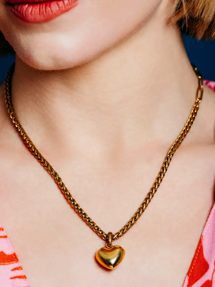 The Lovita Necklace features a graceful wheat chain paired with a soft puff heart charm, creating a meaningful piece that gently expresses care and affection. Designed for everyday comfort, this necklace serves as a constant reminder of support and connection, adding a subtle yet heartfelt touch to any look. 24k Gold Plated. Lobster Claw Closure. Made in the U.S.A