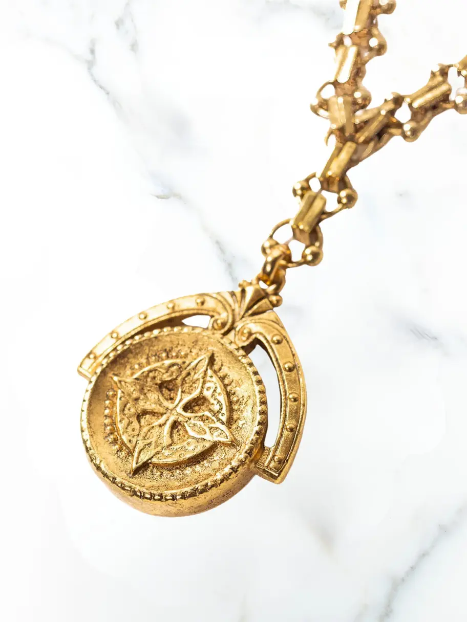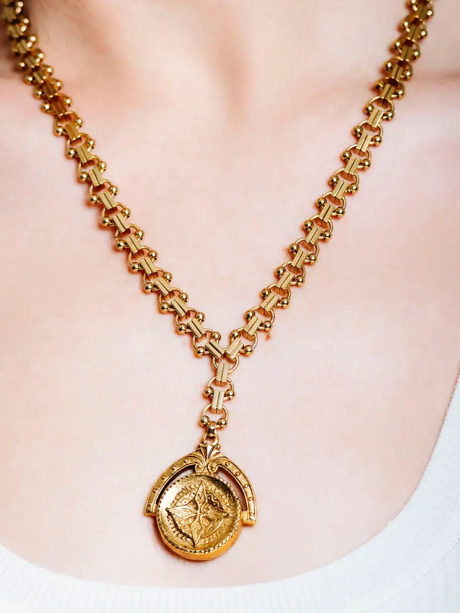 The Shavon Necklace features a mix of double oval and round links, complemented by a round disc charm with beautifully etched floral details and an etched arc at the top. This unique combination adds a touch of elegance and subtle artistry, making it a versatile piece to support your everyday style with grace. 24K Gold Plate. Lobster Claw Closure. Proudly made in the U.S.A