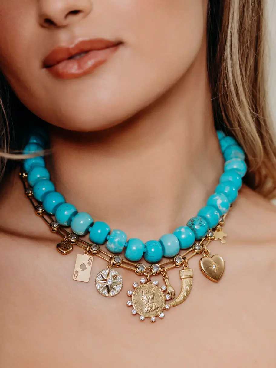 Elevate your style with our Turqina Necklace! Made with howlite turquoise beads and faux turquoise spacers, it adds a touch of elegance to any outfit. Express your unique sense of fashion and enjoy the benefits of a versatile necklace that complements any look. 24k Gold Plated. Lobster Claw Closure. Made in the U.S.A